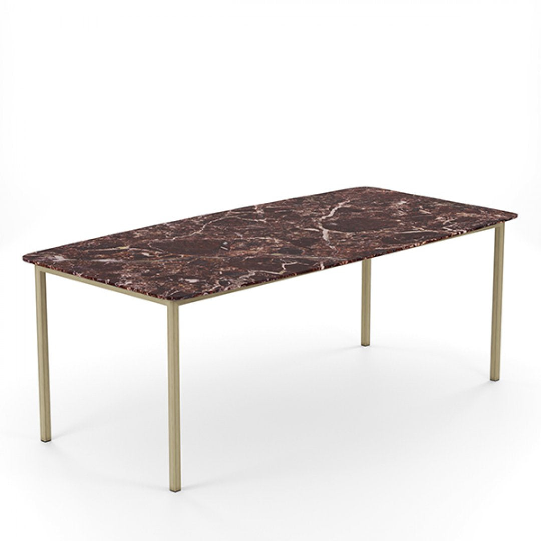 Deze stijlvolle eettafel combineert verfijnde eenvoud met de rijke uitstraling van Rosso Levanto marmer. Het diepe roodbruine blad, met subtiele witte adering, creëert een gevoel van luxe en warmte. Het minimalistische, goudkleurige onderstel geeft de tafel een moderne en verfijnde uitstraling, waardoor deze perfect past in zowel klassieke als hedendaagse interieurs.