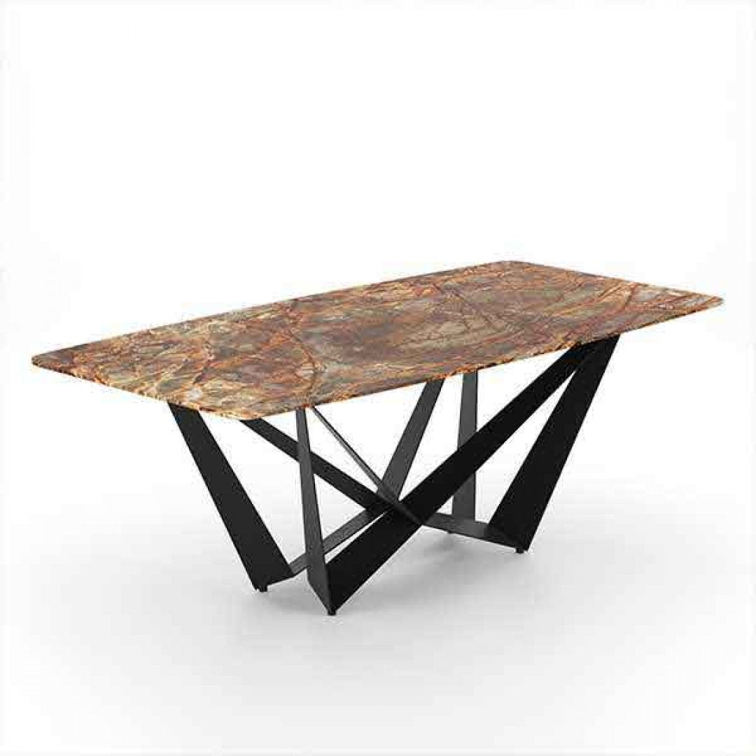 Luxe Eettafel met Forest Brown Marmer en Dynamisch Geometrisch Onderstel