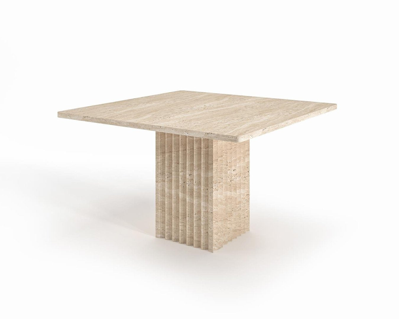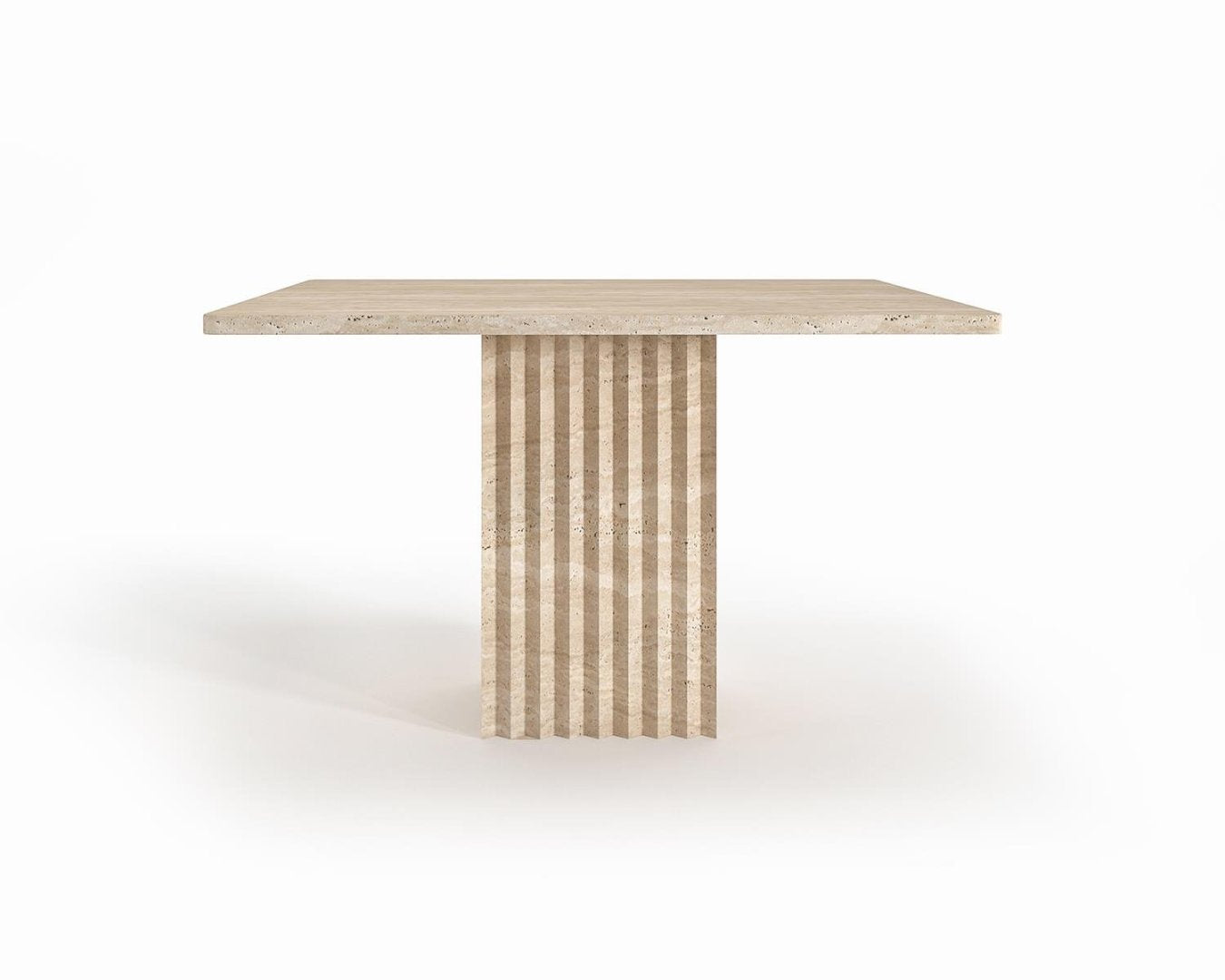 Deze luxueuze travertijn eettafel straalt pure elegantie en architectonische finesse uit. Met zijn strakke lijnen, massieve constructie en natuurlijke steentextuur vormt deze tafel een perfecte balans tussen modern design en tijdloze klasse. Het vierkante blad en de verticale groeven in het onderstel geven de tafel een dynamische en sculpturale uitstraling.