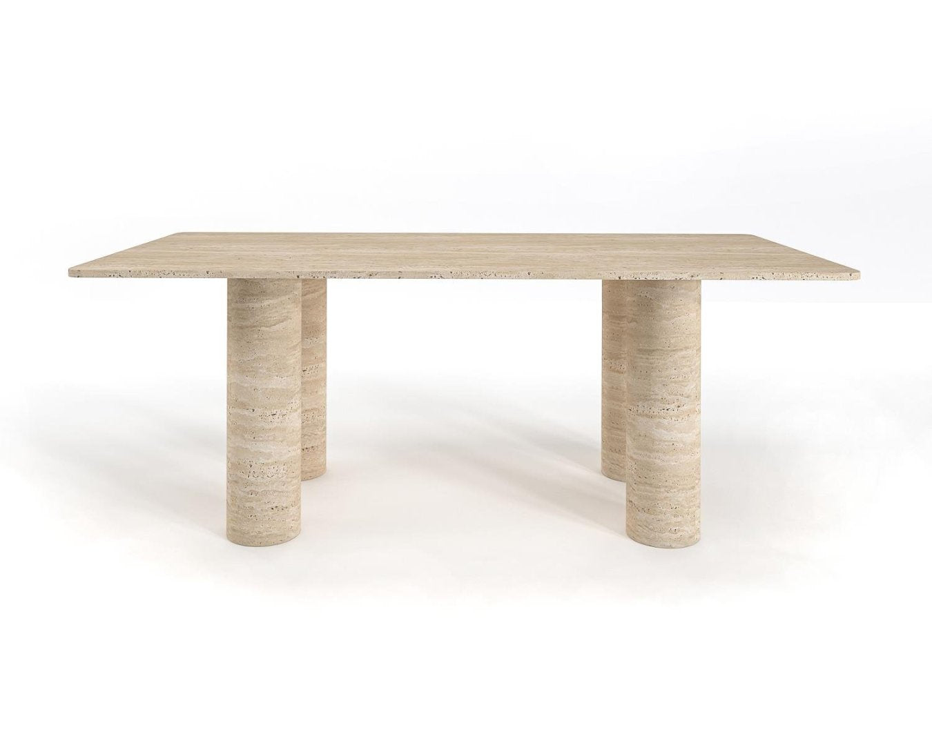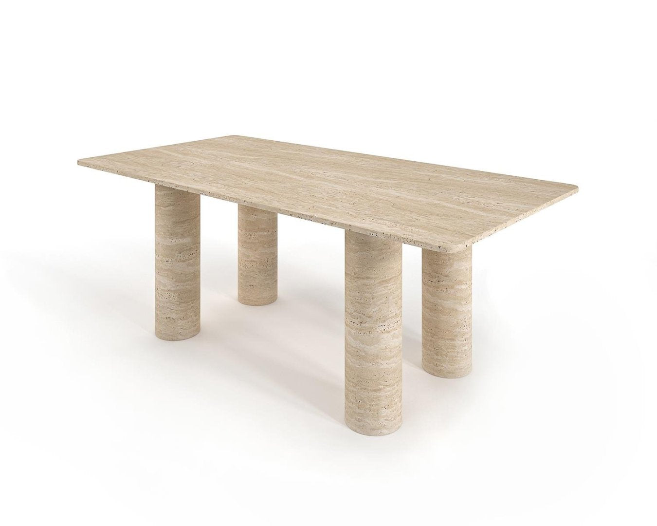 Deze elegante rechthoekige travertijn eettafel combineert minimalistische verfijning met de warme, natuurlijke uitstraling van natuursteen. Met zijn strakke lijnen en stevige cilindervormige poten straalt deze tafel tijdloze klasse en robuustheid uit. Ideaal voor zowel moderne als klassieke interieurs!
