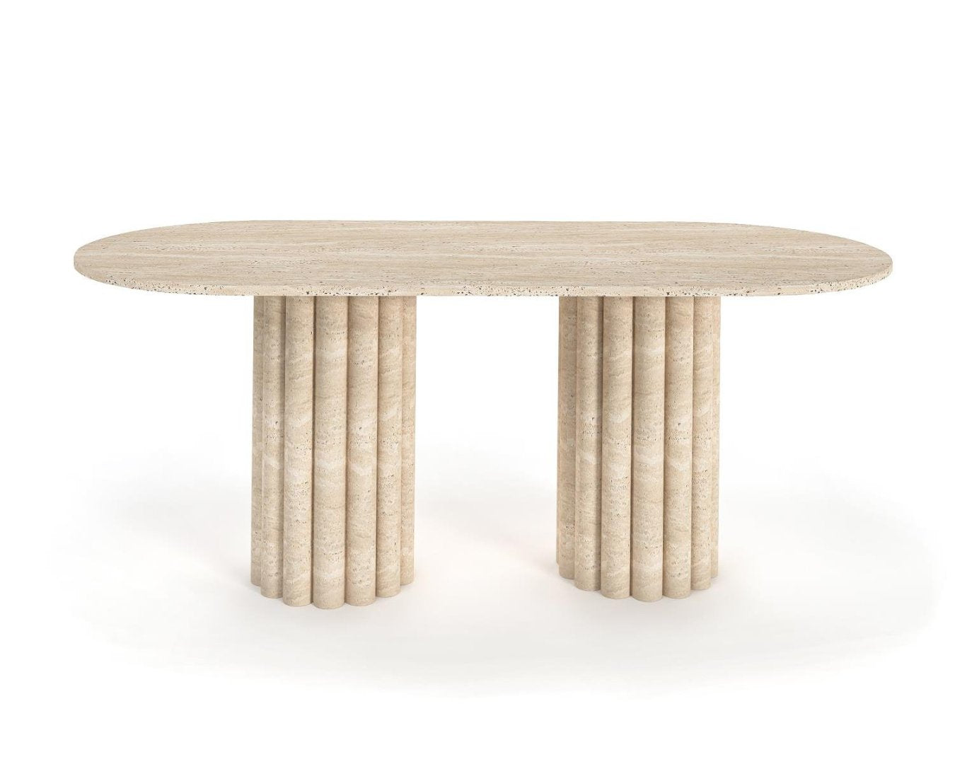 De tafel wordt ondersteund door twee stevige zuilvormige poten, die bestaan uit meerdere verticale elementen. Dit detail voegt een architectonisch karakter toe en verwijst naar klassieke en moderne designstijlen. De ribbelstructuur van de poten creëert een spel van licht en schaduw, waardoor de textuur van het natuursteen extra wordt benadrukt.