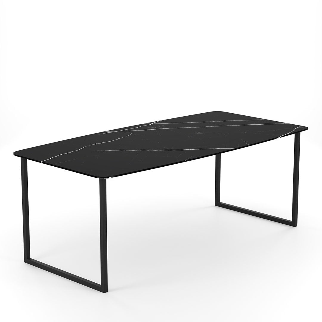 Moderne Eettafel met Nero Marquina Marmer en Minimalistisch Zwart Metalen Frame