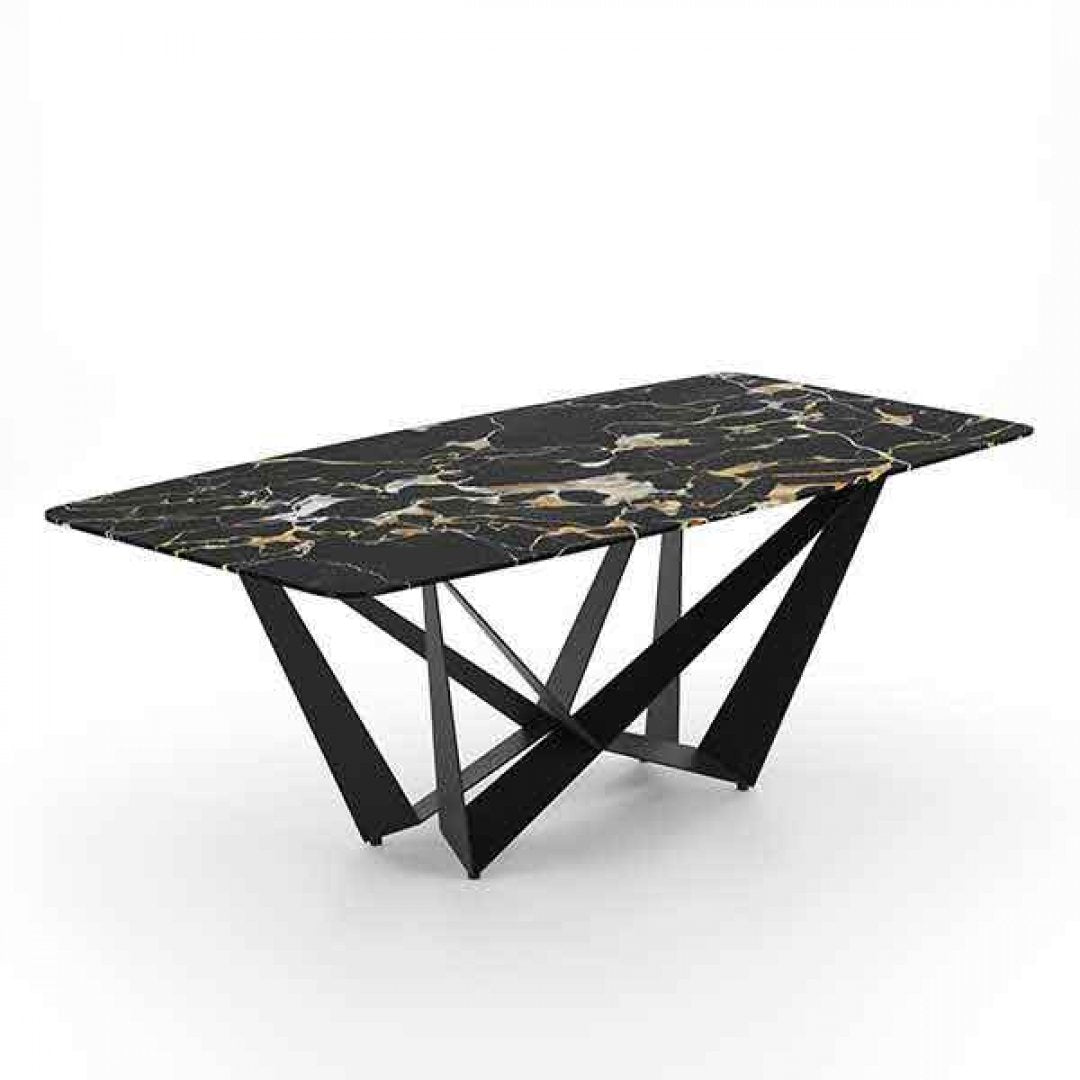 Deze exclusieve eettafel combineert de luxe uitstraling van Portoro Gold marmer met een modern, architectonisch onderstel van zwart gepoedercoat staal. Het unieke aderpatroon in goud- en wittinten op de diepzwarte achtergrond maakt elke tafel een waar kunstwerk. Het geometrische onderstel zorgt voor een gedurfd design en stabiliteit, waardoor deze tafel een echte eyecatcher is in elk interieur.